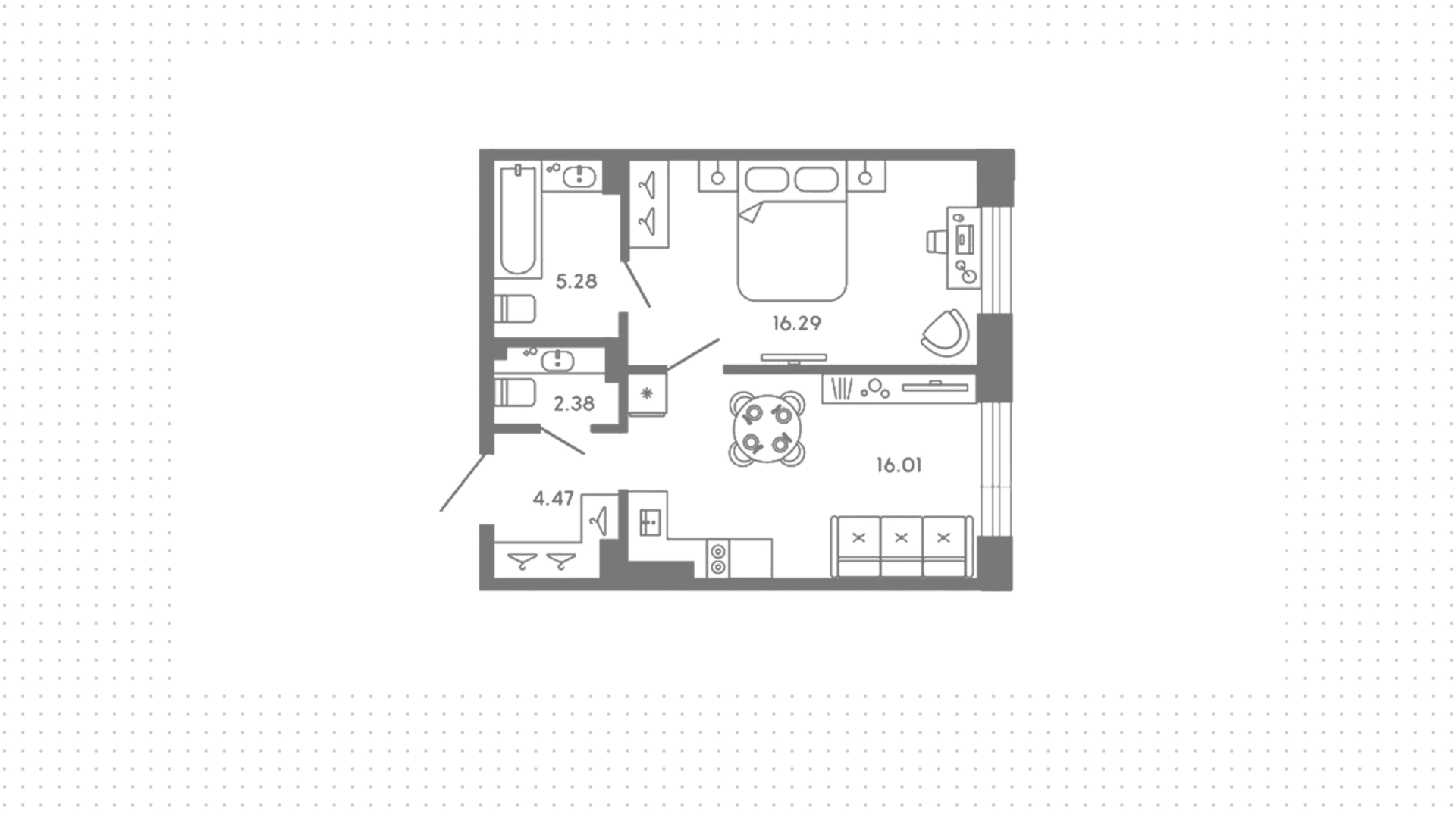 Квартира с 1-й спальней, 44 м²