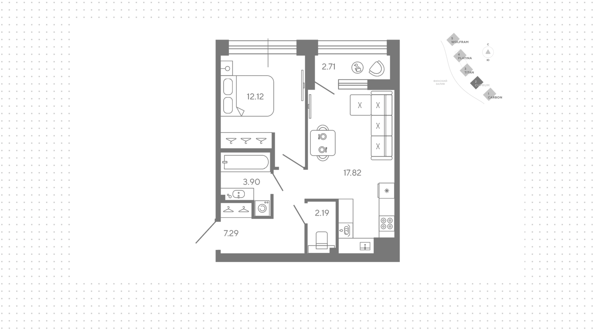Квартиры c 1 спальней, 44 м² в ЖК Bashni Element, 8 этаж
