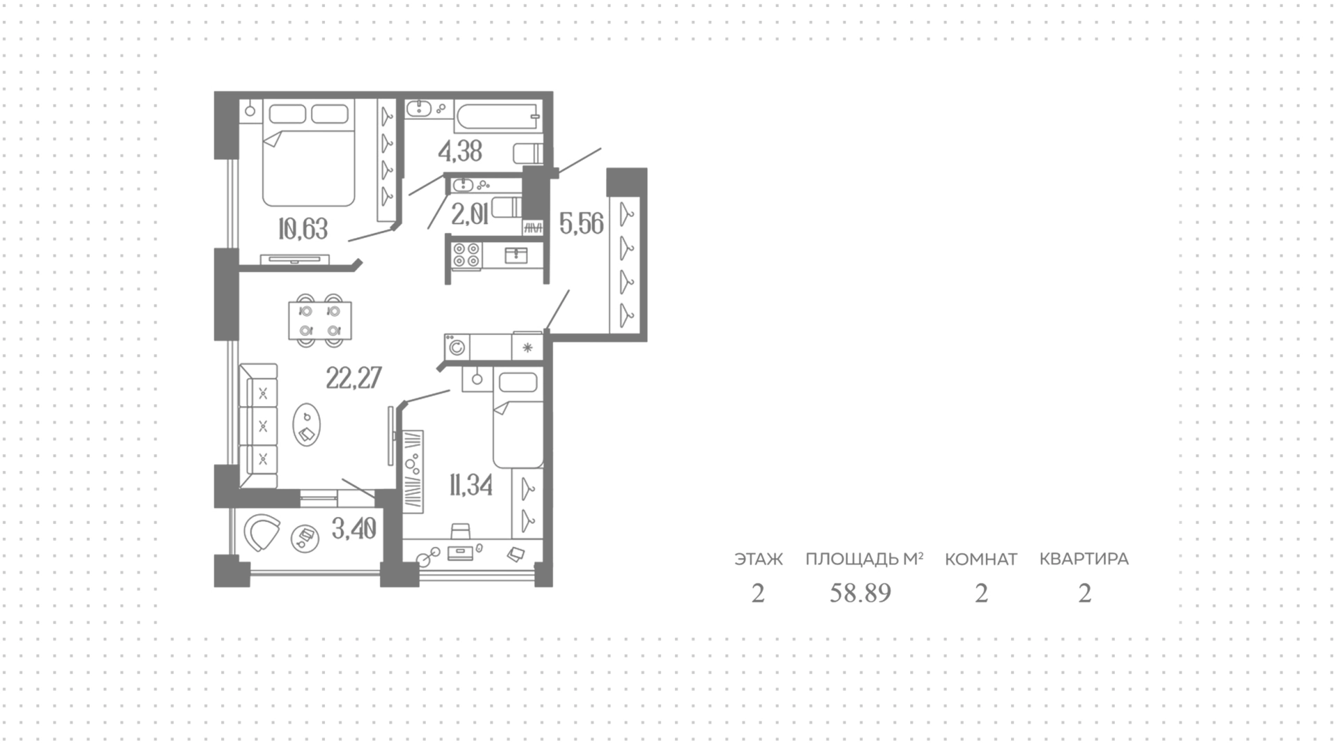 Квартиры c 2 спальнями, 58 м² в ЖК 1919, 2 этаж