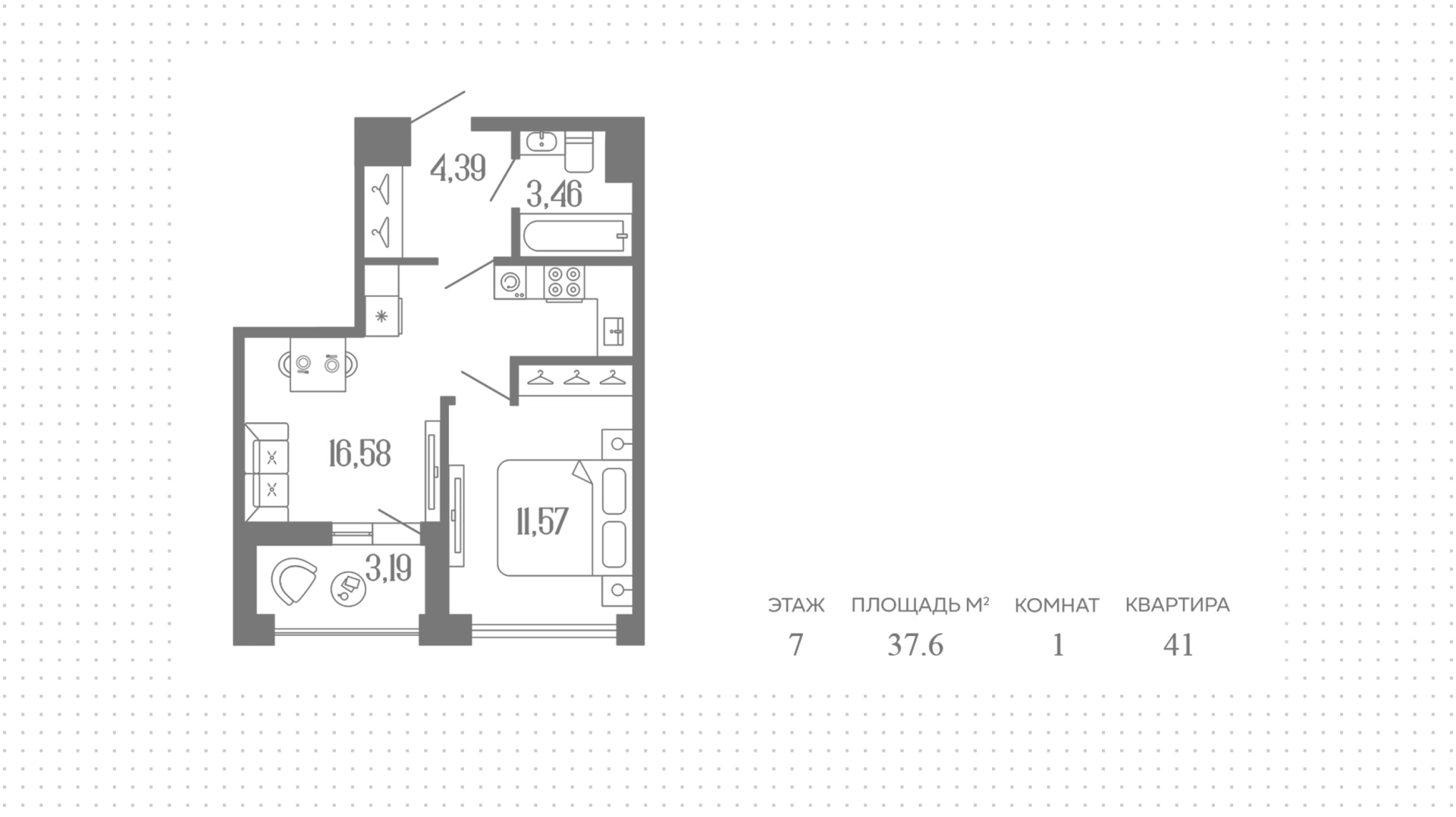 Квартиры c 1 спальней, 37 м² в ЖК 1919, 7 этаж