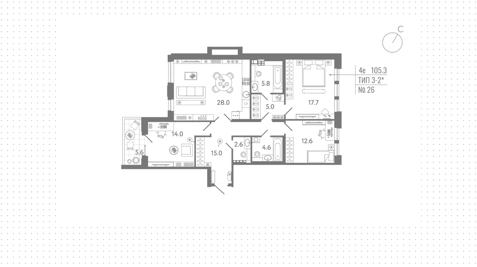 Квартиры c 3 спальнями, 105 м² в ЖК Коллекционер, 4 этаж
