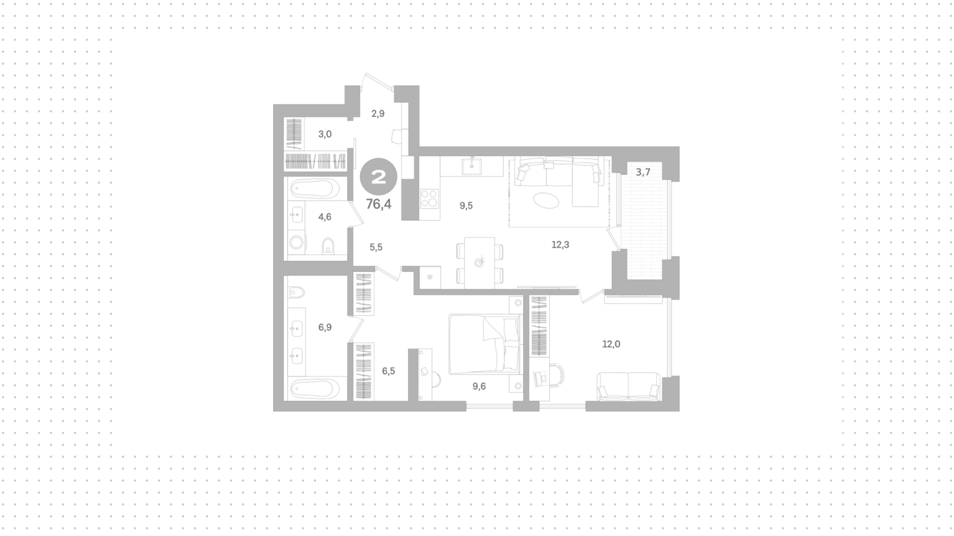 Квартиры c 2 спальнями, 76 м² в ЖК Северный ветер, 6 этаж
