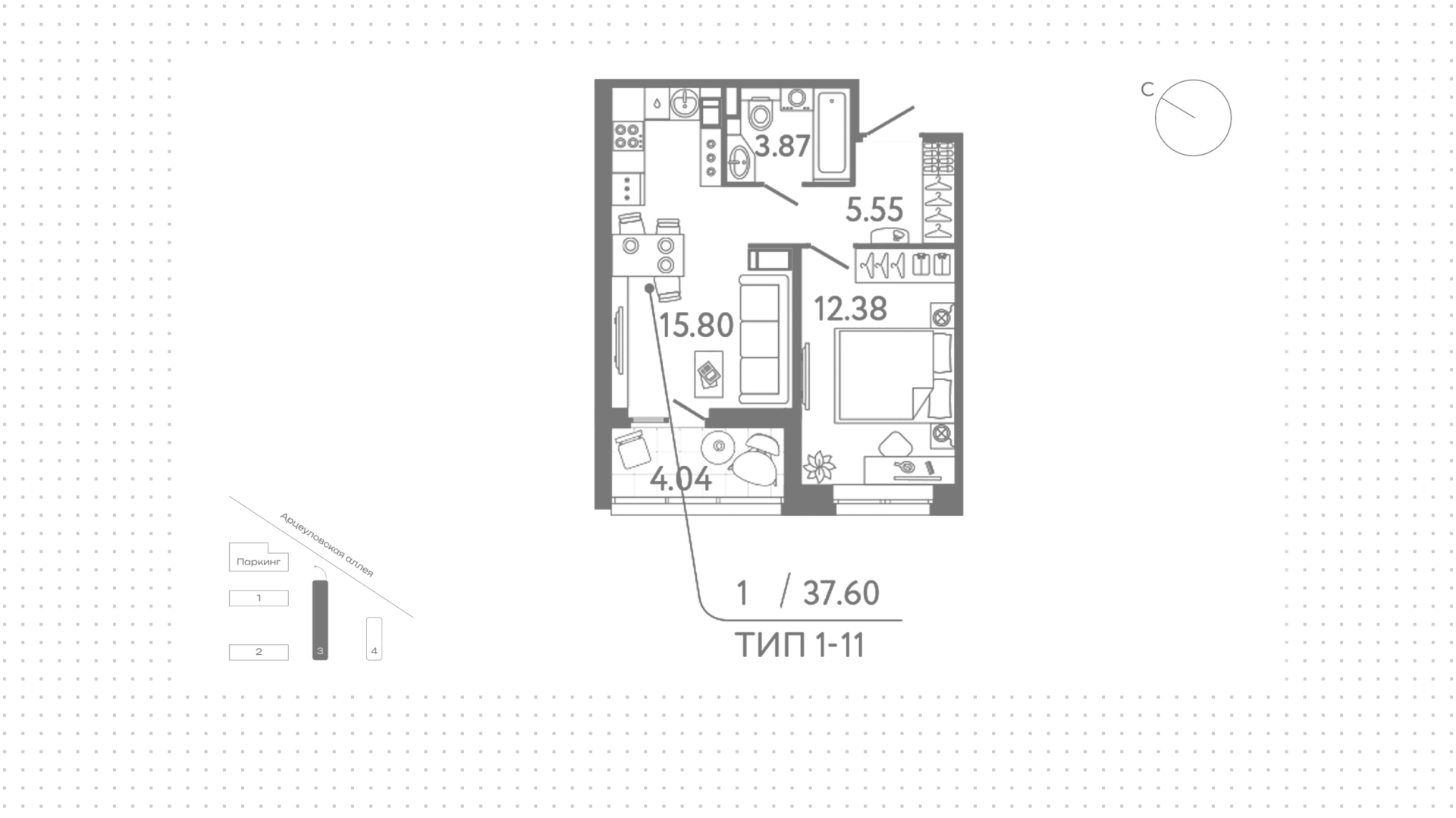 Квартира с 1 спальней, 37 м²