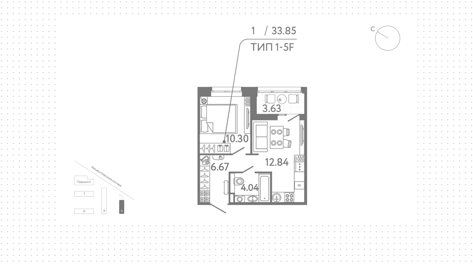 Квартира с 1 спальней, 33 м²