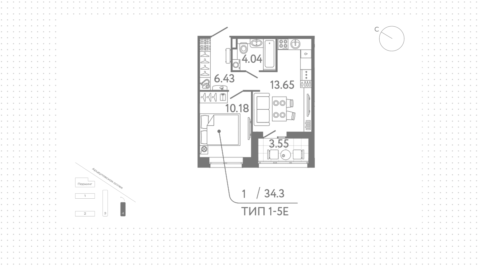 Квартира с 1 спальней, 34 м²