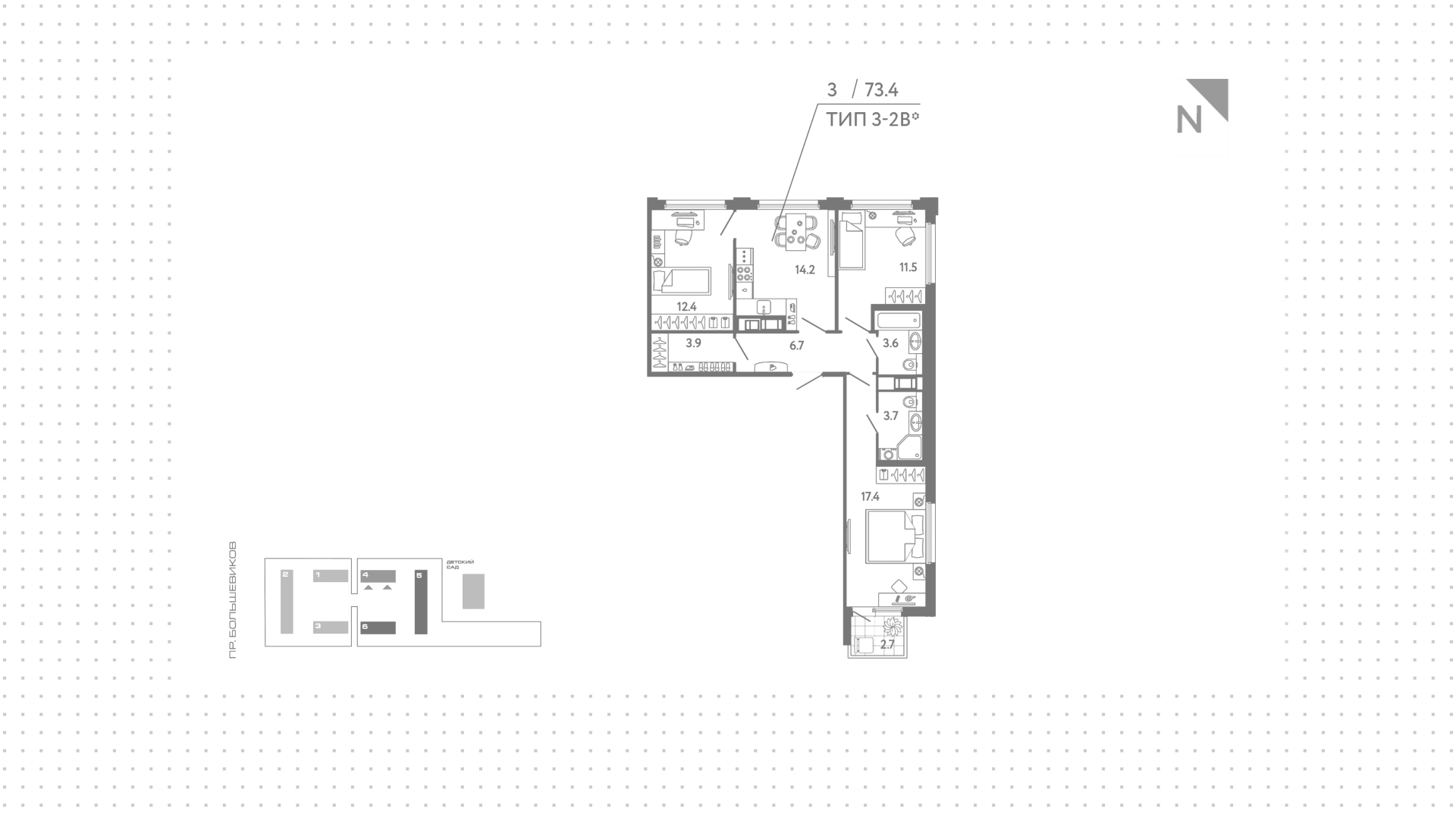 Квартиры c 3 спальнями, 73 м² в ЖК Гений, 11 этаж