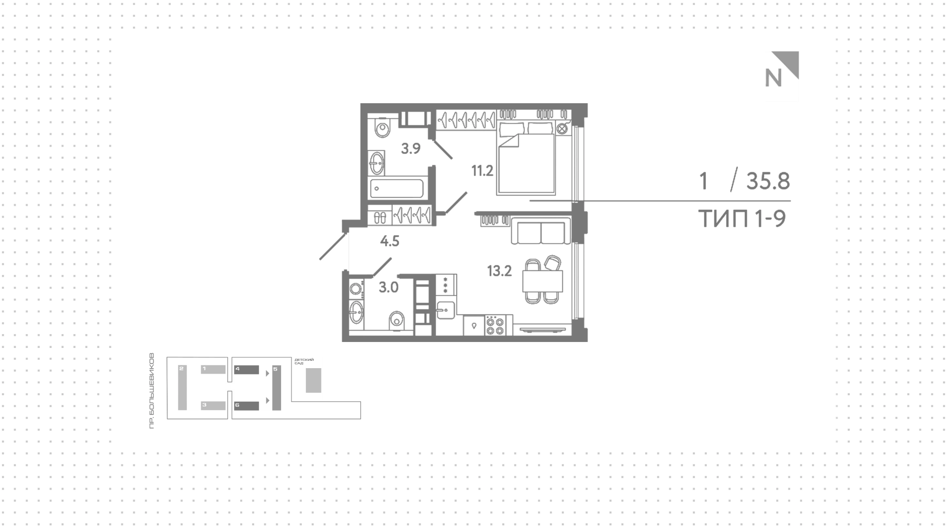 Квартиры c 1 спальней, 35 м² в ЖК Гений, 4 этаж