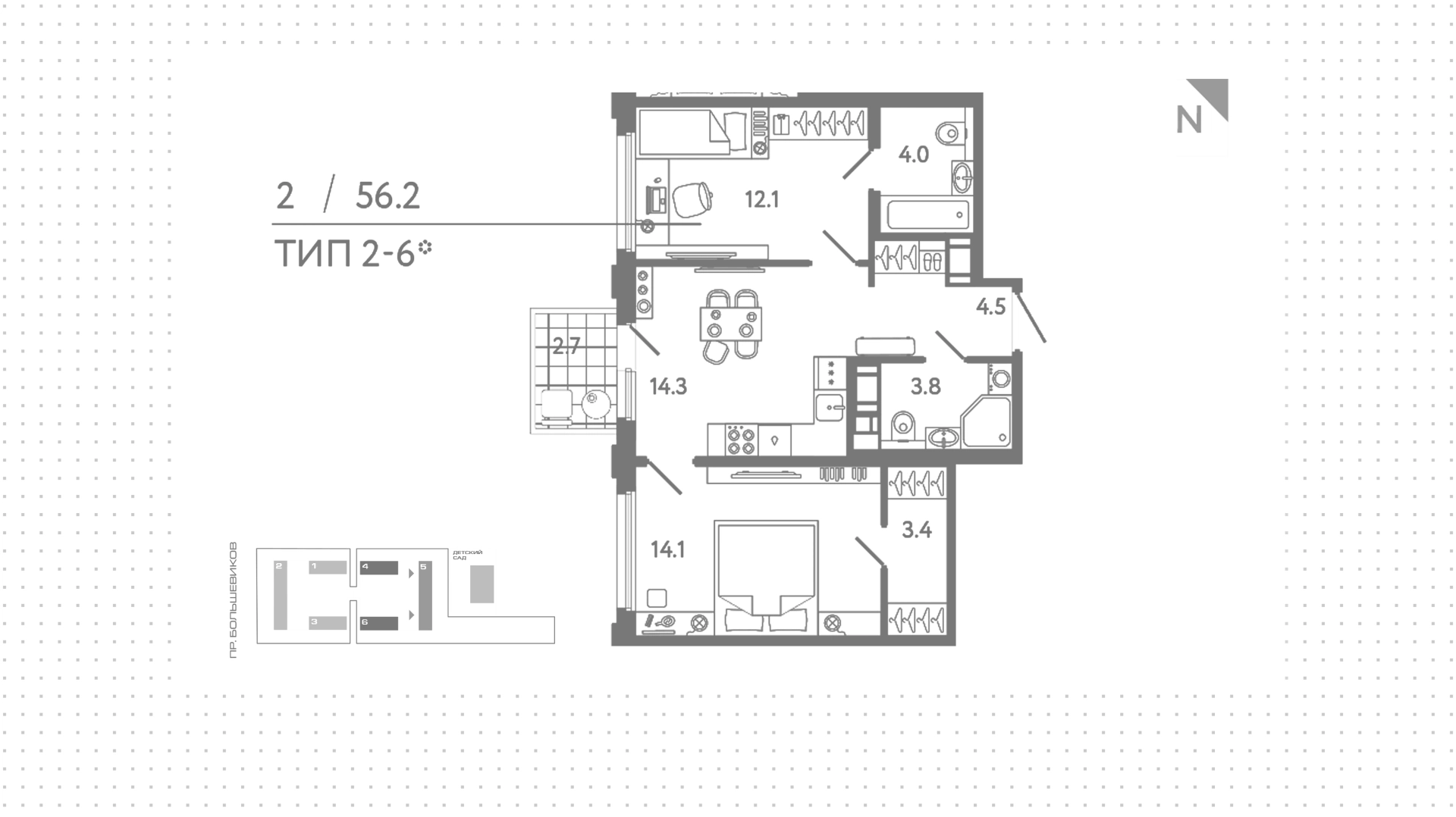 Квартиры c 2 спальнями, 56 м² в ЖК Гений, 12 этаж