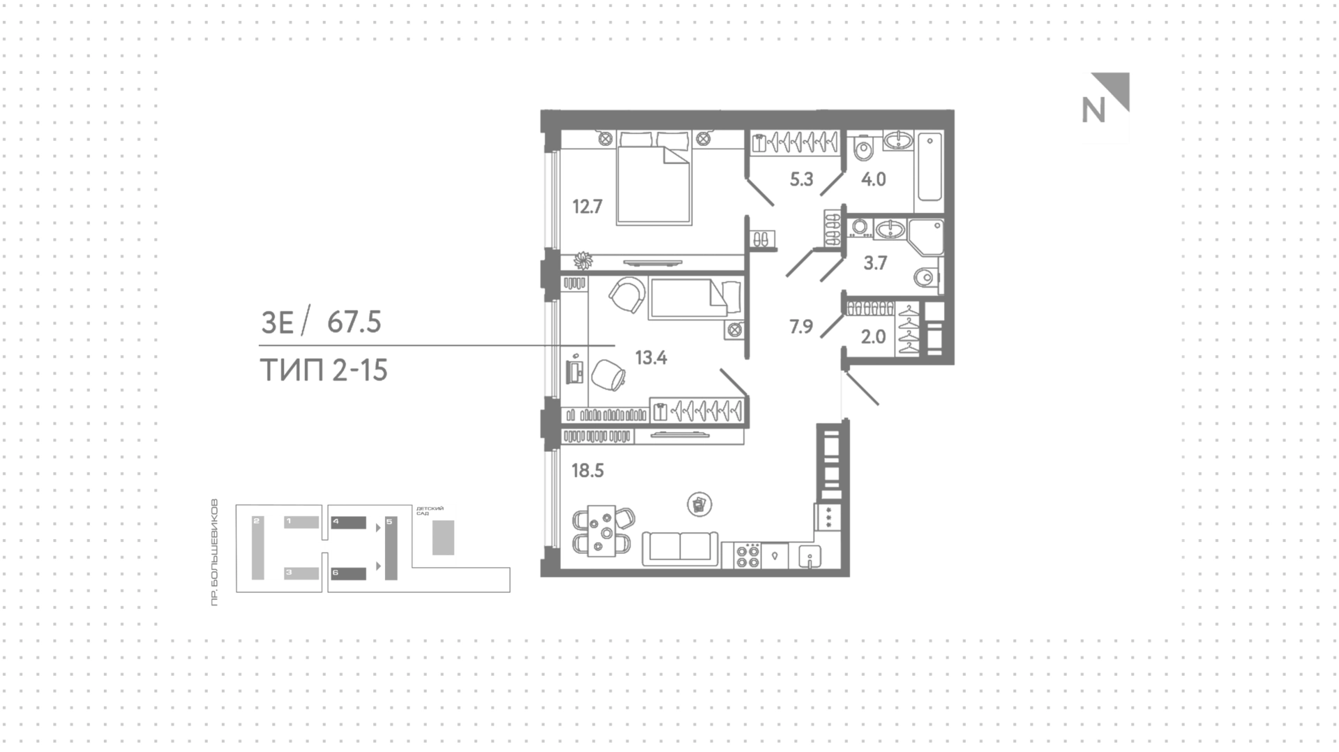 Квартира с 2 спальнями, 67 м²