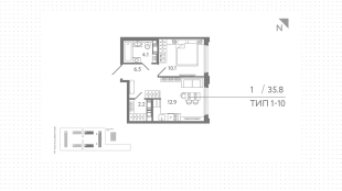 Квартира с 1 спальней, 35 м²