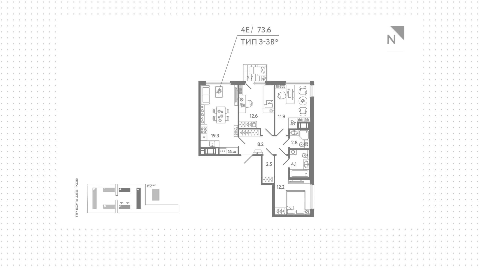Квартиры c 3 спальнями, 73 м² в ЖК Гений, 11 этаж