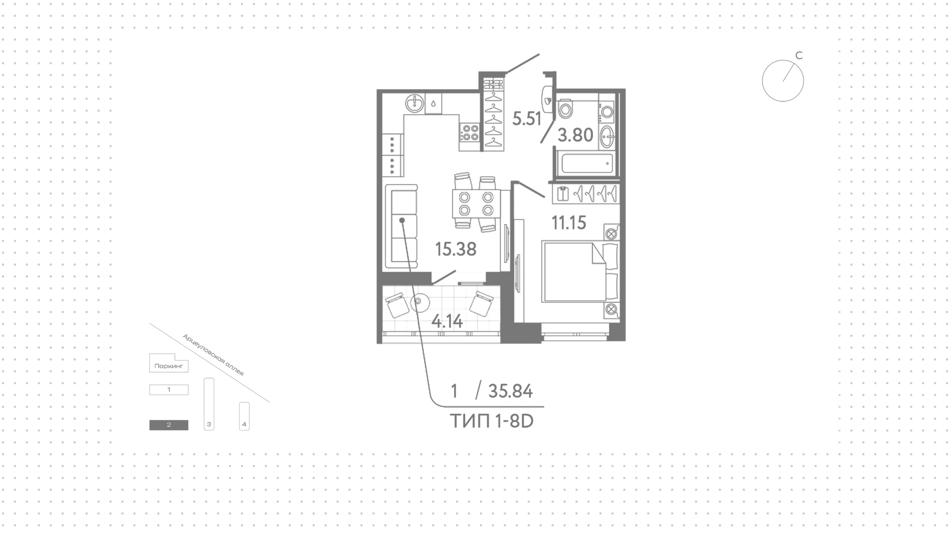 Квартира с 1 спальней, 35 м²