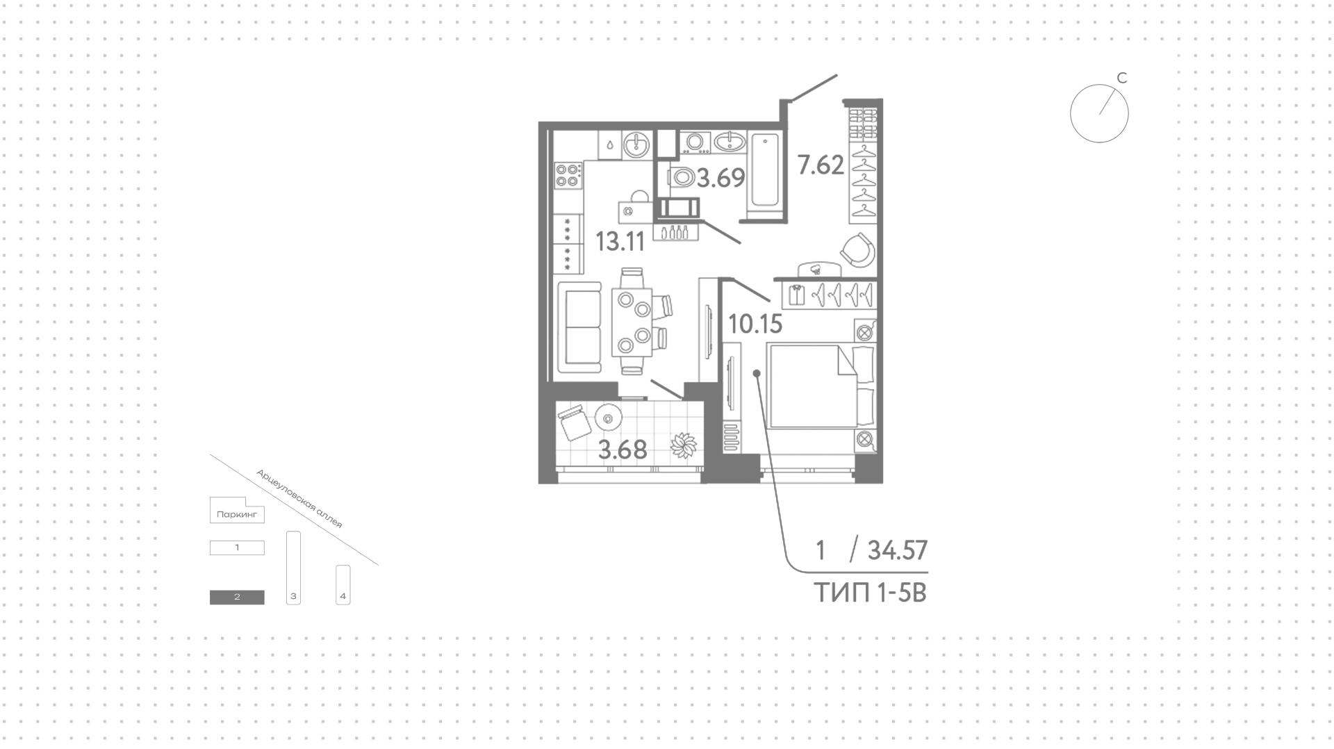 Квартира с 1 спальней, 34 м²