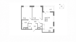 Квартиры c 2 спальнями, 60 м² в ЖК Литера, 9 этаж