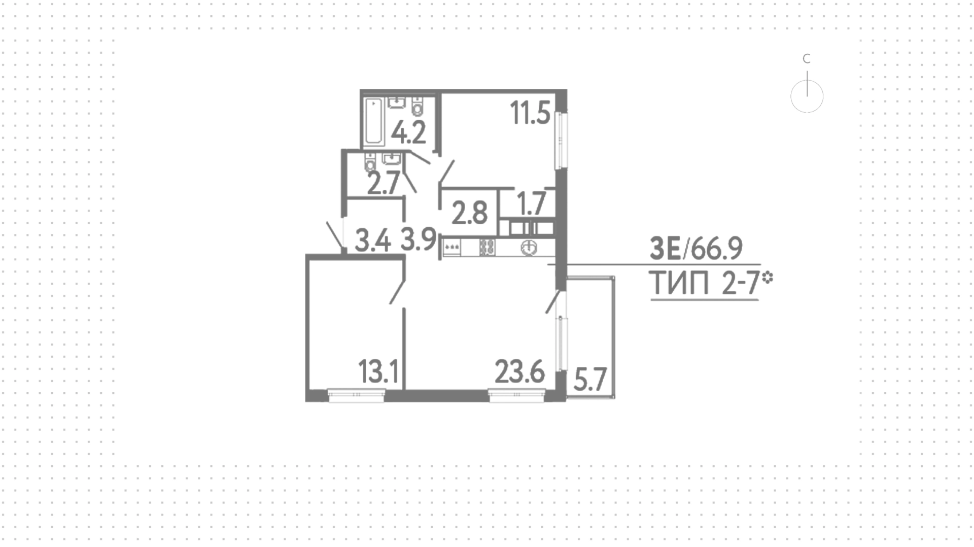 Квартира с 2 спальнями, 66 м²