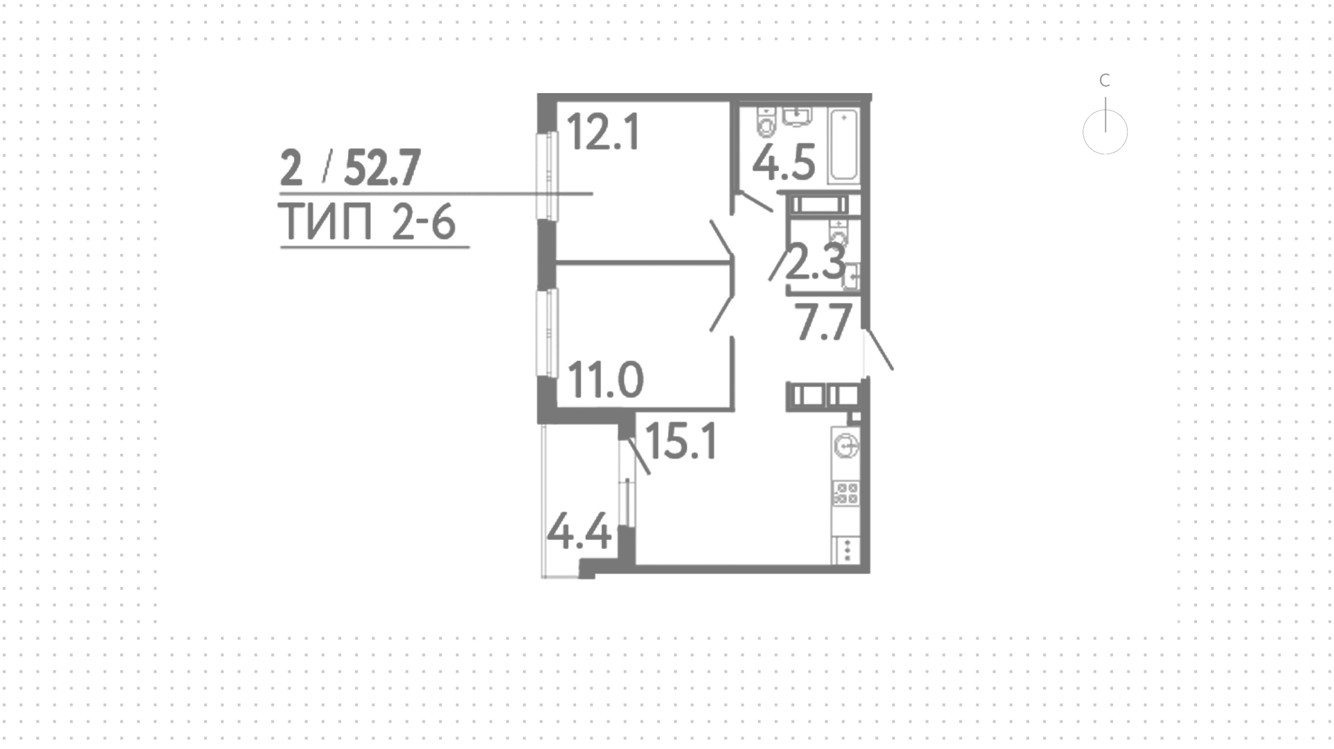 Квартиры c 2 спальнями, 52 м² в ЖК Передвижники, 10 этаж