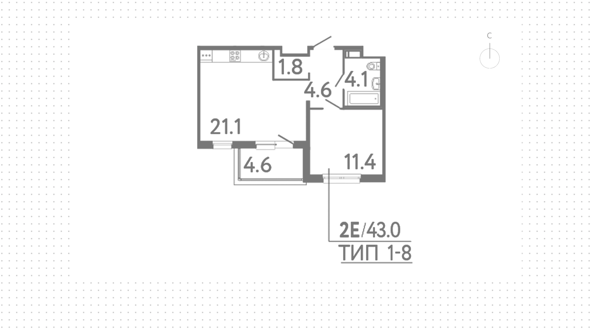 Квартиры c 1 спальней, 43 м² в ЖК Передвижники, 11 этаж