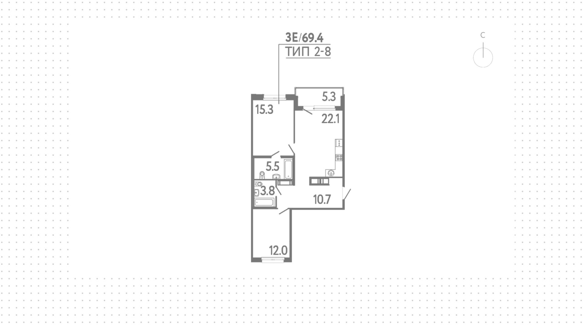 Квартира с 2 спальнями, 69 м²