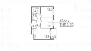 Квартиры c 2 спальнями, 55 м² в ЖК Передвижники, 2 этаж