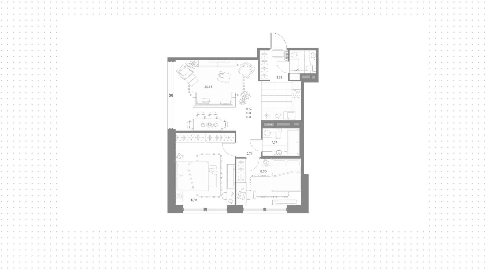Квартира с 2 спальнями, 73 м²