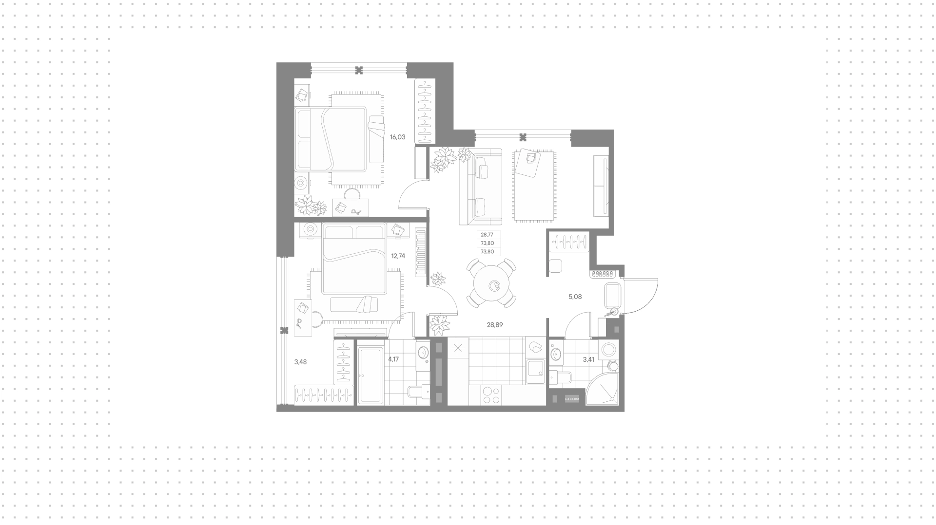 Квартира с 2 спальнями, 73 м²