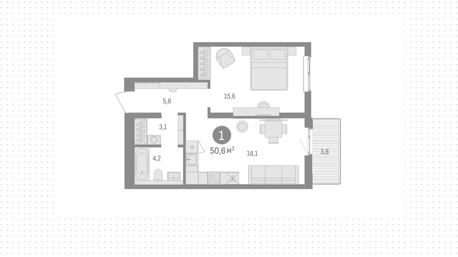 Квартиры c 1 спальней, 50 м² в ЖК Северный ветер, 5 этаж