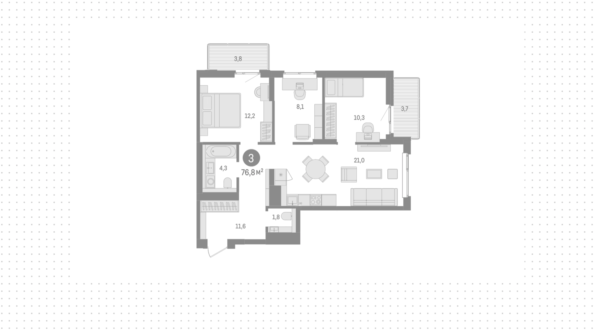 Квартиры c 3 спальнями, 76 м² в ЖК Северный ветер, 8 этаж