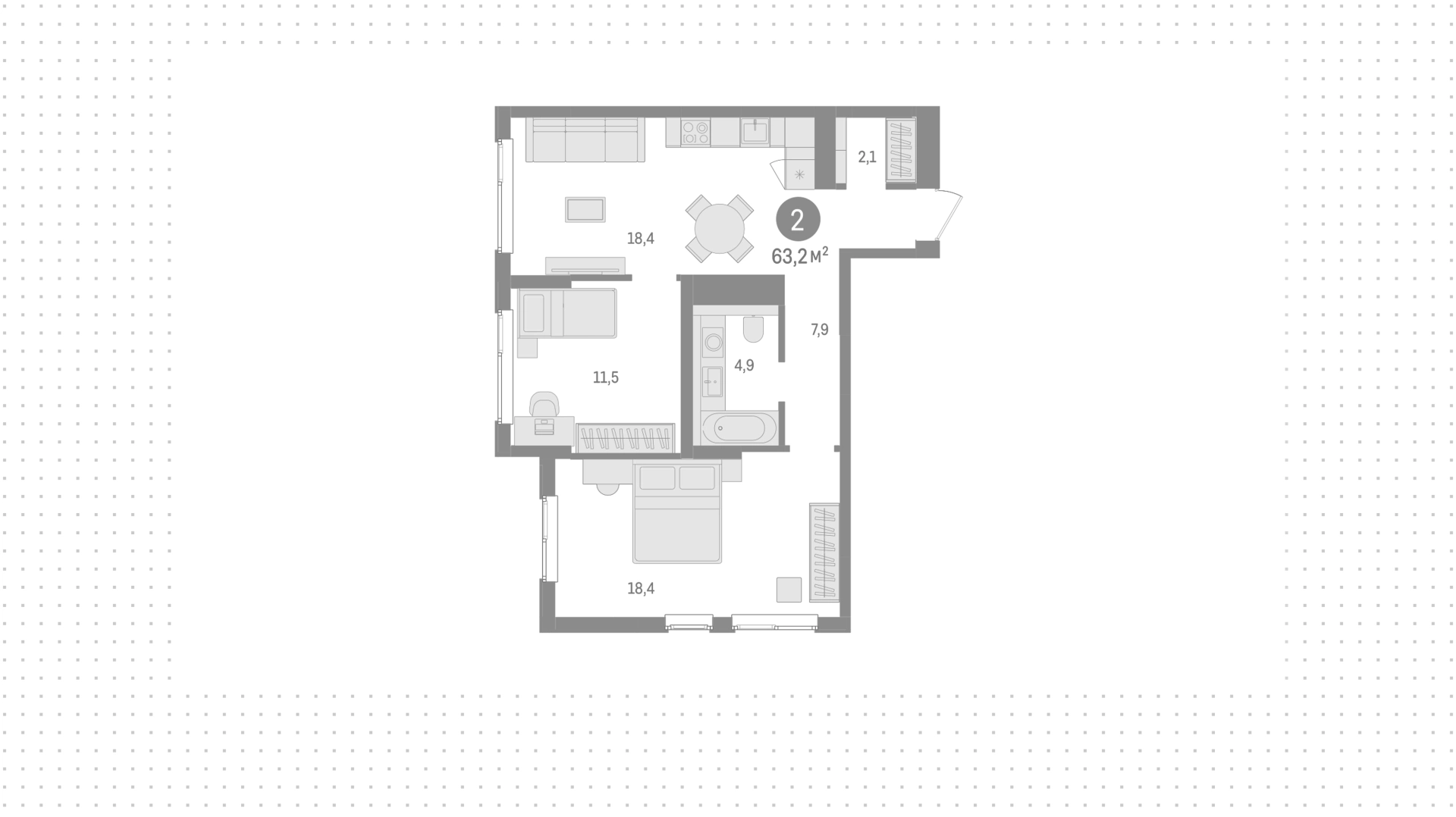 Квартиры c 2 спальнями, 63 м² в ЖК Северный ветер, 2 этаж