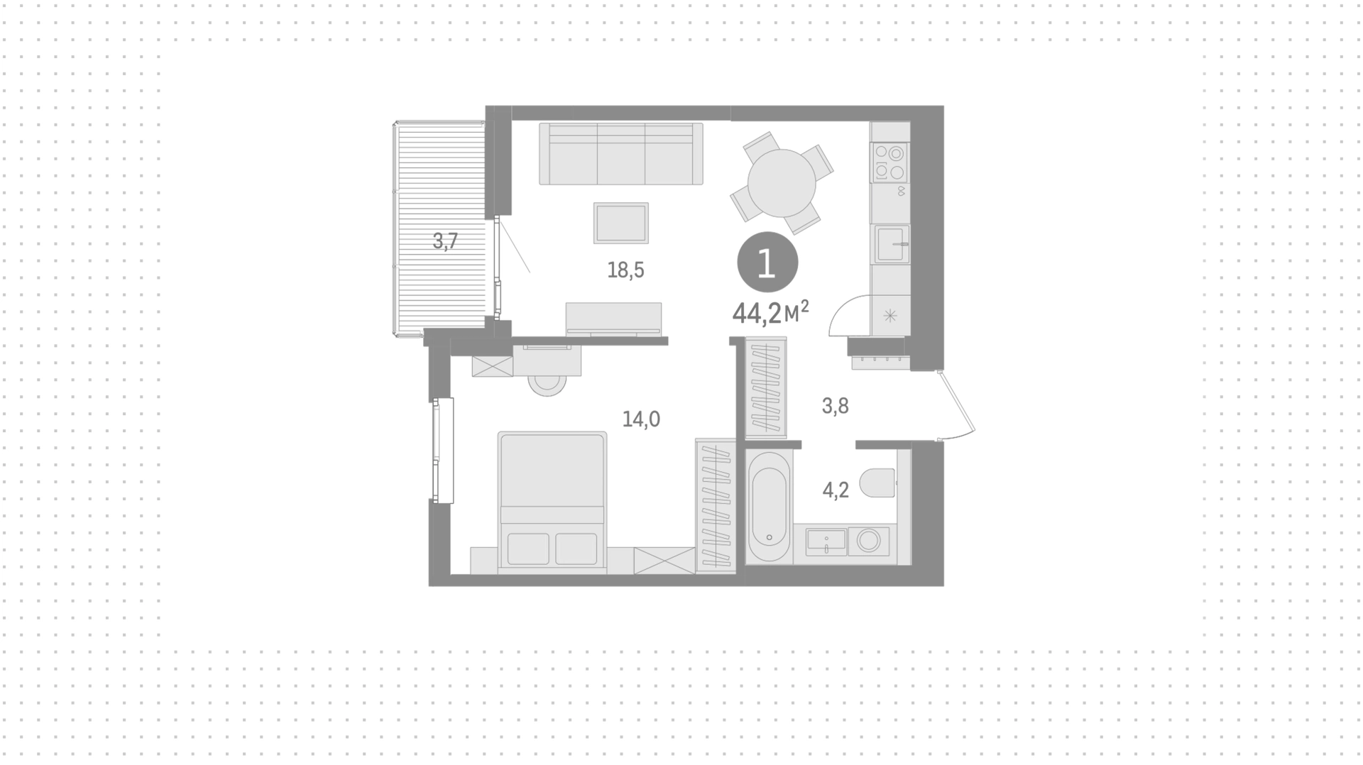 Квартиры c 1 спальней, 44 м² в ЖК Северный ветер, 5 этаж