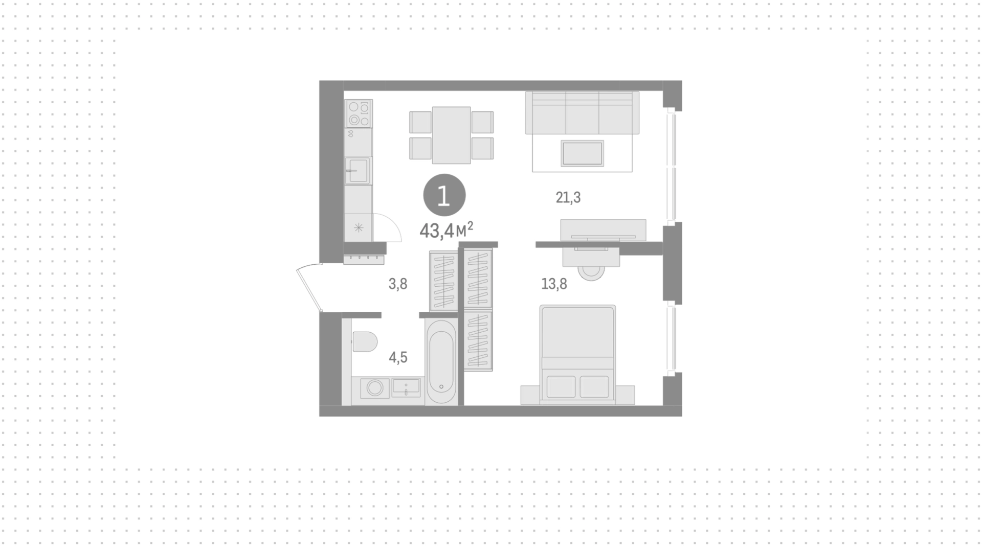 Квартиры c 1 спальней, 43 м² в ЖК Северный ветер, 1 этаж